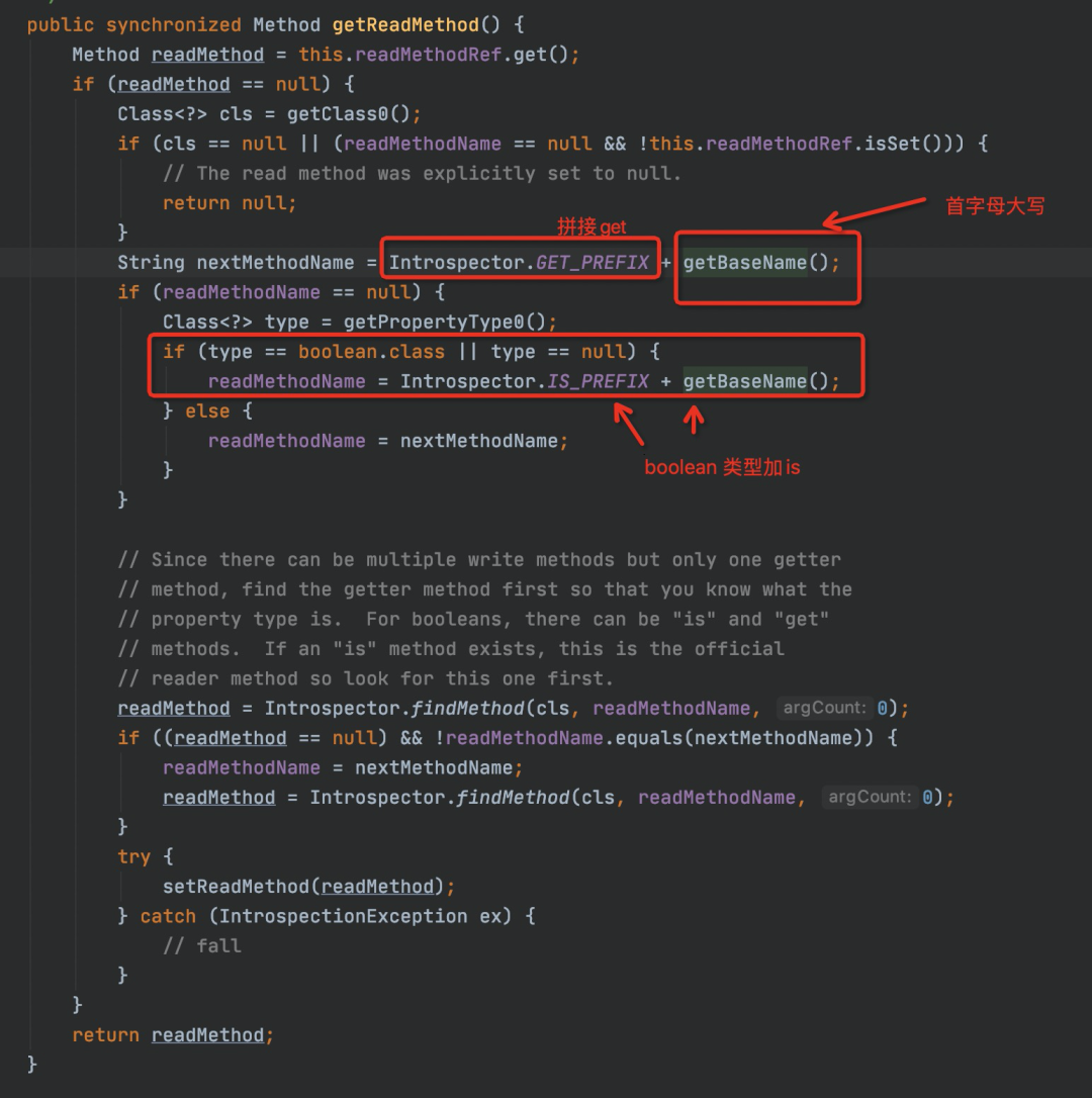 大家注意到没有,如果是boolean 类型的,处理逻辑不太一样,get方法是加 “is”, 这就是为什么项目开发都会禁止boolean类型变量是“is” 打头,因为框架有规约,boolean 类型的get方法不是getBoolean(), 而是 isXXX(),而且一般boolean 类型属性的获取方法大家都约定 isXXX(),大家可以检查一下自己项目里面boolean类型的变量是不是遵守规范了。