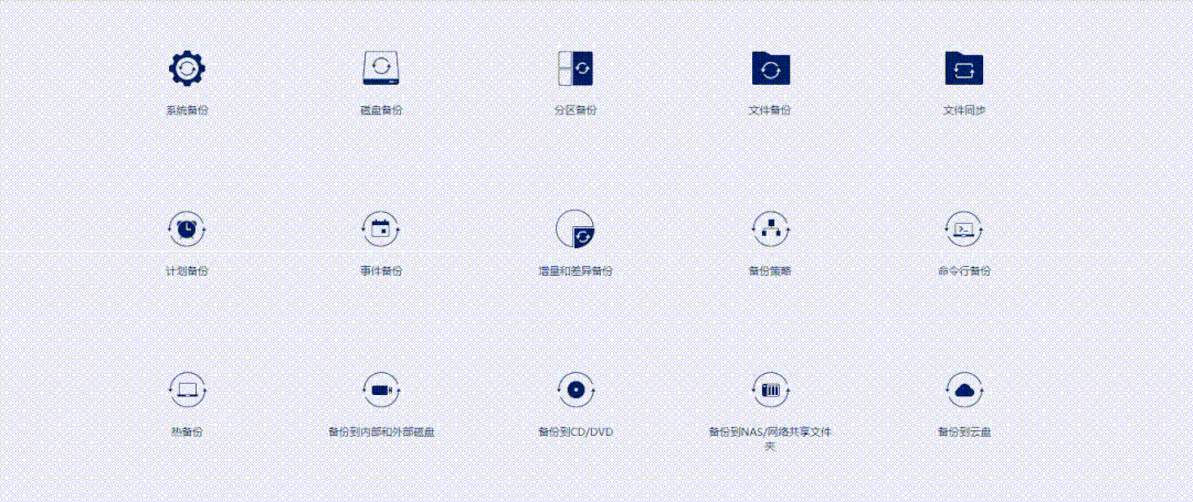 EasyBackup的备份功能及其丰富,具备系统备份、磁盘备份、分区备份、文件备份、文件同步、计划备份、事件备份、增量和差异备份、备份策略、命令行备份、热备份、备份到内部和外部磁盘、备份到CD/DVD、备份到NAS/网络共享文件夹、备份到云盘等
