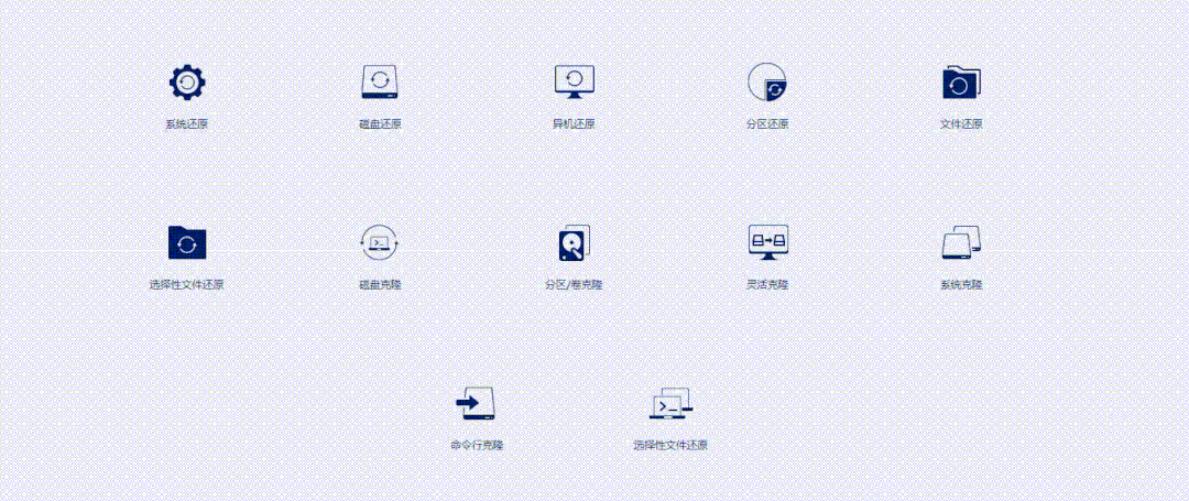 EasyBackup包含系统还原、磁盘还原、异机还原、分区还原、文件还原、选择性文件还原、磁盘克隆、分区/卷克隆、灵活克隆、系统克隆、命令行克隆等