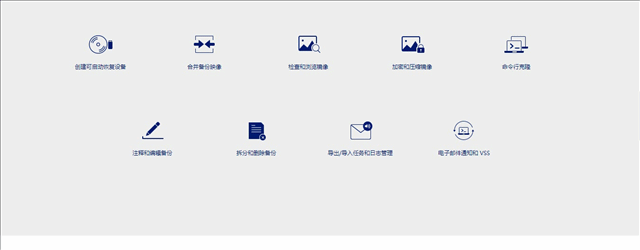 其他实用功能有创建可启动恢复设备、合并备份映像、检查和浏览镜像、加密和压缩镜像、命令行克隆、注释和编辑备份、拆分和删除备份、导出/导入任务和日志管理、电子邮件通知和 VSS等