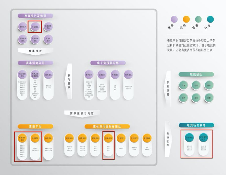 下图用红框圈出来的部分:赛事发行及运营、直播平台、媒体及内容制作团队、电竞衍生领域这四个部分是对技术人员需求比较大的方向。
