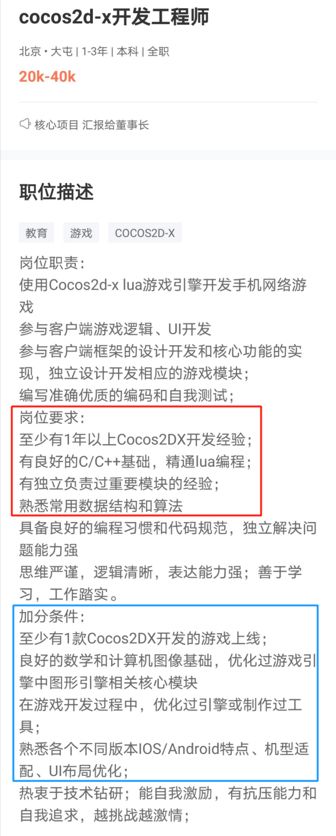 这些公司的岗位设置基本分为:游戏策划、开发(前后端、iOS、Android、cocos2d-x 等等)、运维、算法、引擎工程师等,薪资也从 15~50K 不等,列出一个完美世界 cocos2d-x 开发工程师的岗位职责要求,供参考。