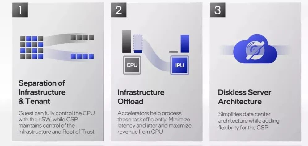 Intel 2015年底收购了Xilinx的竞争对手——Altera,在通用处理器的基础上,进一步完善硬件加速能力。Intel 2021年6月新发布的IPU产品(可以被视为Intel版本的DPU),将FPGA与Xeon D系列处理器集成,成为了DPU赛道有力的竞争者。IPU是具有强化的加速器和以太网连接的高级网络设备,它使用紧密耦合、专用的可编程内核加速和管理基础架构功能。IPU提供全面的基础架构分载,并可作为运行基础架构应用的主机的控制点,从而提供一层额外防护。几乎同一时间,Marvall发布了OCTEON 10 DPU产品,不仅具备强大的转发能力,还具有突出的AI处理能力。