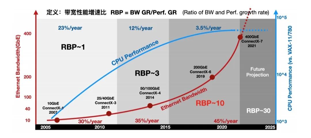2010年前,网络的带宽年化增长大约是30%,到2015年微增到35%,然后在近年达到45%。相对应的,CPU的性能增长从10年前的23%,下降到12%,并在近年直接降低到3%。在这三个时间段内,RBP指标从1附近,上升到3,并在近年超过了10!如果在网络带宽增速与CPU性能增速近乎持平,RGR~1,IO压力尚未显现出来,那么当目前RBP达到10倍的情形下,CPU几乎已经无法直接应对网络带宽的增速。RBP指标在近几年剧增也许是DPU终于等到机会“横空出世”的重要原因之一。