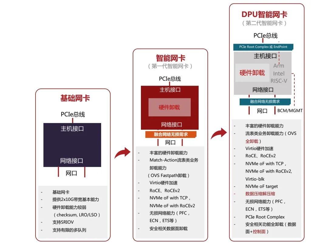 随着云平台虚拟化技术的发展,智能网卡的发展基本可以分为三个阶段(如图1-2所示):