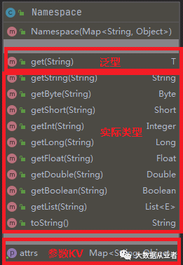 题外话:这个Namespace类设计的很方便。该类实际包装一个Map(存储解析出来的命令行参数KV),通过一个get()方法返回泛型类结果,然后getString()、getByte()、getShort()、getInt()、getLong()、getFloat()、getDouble()、getBoolean()、getList()等方法调用get()方法获取指定数据类型的返回结果。这样的设计很方便获取各种类型的命令行参数值,完全可以复用在别的日常开发中。Namespace具体类结构如图所示: