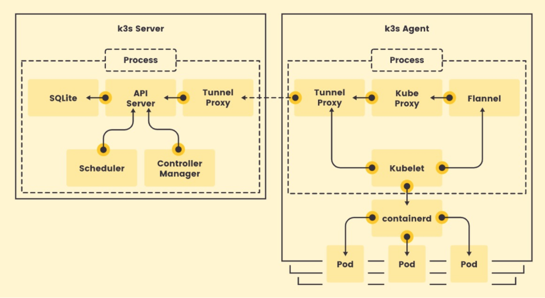 事实上,K3S就是基于一个特定版本Kubernetes(例如:1.13)直接做了代码修改。K3S分Server和Agent,Server就是Kubernetes管理面组件 + SQLite和Tunnel Proxy,Agent即Kubernetes的数据面 + Tunnel Proxy。