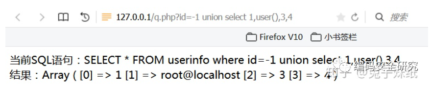 <?php$uid=$_GET['id'];$sql="SELECT * FROM userinfo where id=$uid";$conn=mysql_connect('localhost','root','123456');mysql_select_db("test",$conn);$result=mysql_query($sql, $conn);print_r('当前SQL语句:'.$sql.'<br >结果:');print_r(mysql_fetch_row($result));?>