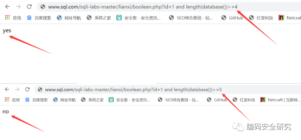 在布尔盲注页面中,程序先获取GET参数id,通过preg_match()函数判断其中是否存在union sleep benchmark等危险字符。然后将参数id拼接到SQL语句,从数据库查询,如果有结果,返回yes,否则返回no。所以访问这个页面,代码根据查询结果返回只返回yes和no,不返回数据库中的任何结果,所以上一种的union注入在这里行不通。尝试利用布尔盲注。布尔盲注是指构造SQL判断语句,通过查看页面的返回结果来推测哪些SQL判断是成立的。例如,我们可以判断数据库名的长度构造语句如下。 and length(database())>=1 #依次增加,查看返回结果