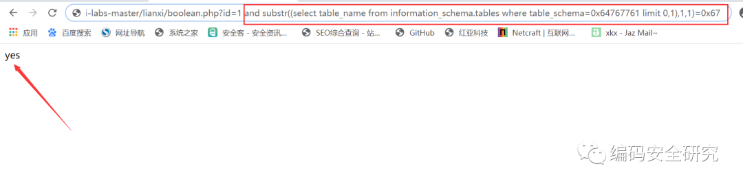 在真实环境中,自己手工的话,工作量有点大,可以借助burp的爆破功能爆破要猜解的字母。同样,也可以利用substr()来猜解表名和字段。构造语句 and substr((select table_name from information_schema.tables where table_schema=库名 limit 0,1),1,1)=要猜解的字母(这里指表名)