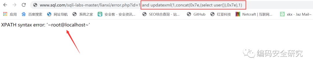 查看代码,在报错注入页面中,程序获取GET参数id后,将id拼接到SQL语句中查询,如果执行成功,就输出ok,如果出错,就通过echo mysqli_error($con)将错误信息输出到页面。我们可以利用这种错误回显,通过updatexml()、floor()等函数将我们要查询的内容显示到页面上。例如,我们通过updatexml()获取user()的值,构造如下语句。 and updatexml(1,concat(0x7e,(select user()),0x7e),1) #0x7e是~16进制编码