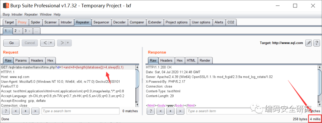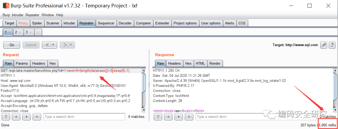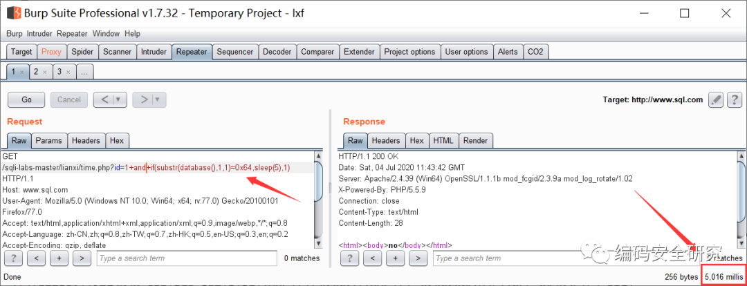 查看代码,在时间盲注页面中,程序获取GET参数id,通过preg_match()函数判断是否存在union危险字符,然后将id拼接到SQL语句中,并带入数据库查询。如果有结果返回yes,没有结果返回no。不返回数据库中的任何数据。它与布尔盲注的不同在于,时间盲注是利用sleep()或benchmark()等函数让执行时间变长。一般和if(expr1,expr2,expr3)结合使用,这里的if语句的含义为如果expr1为真,则if()返回expr2,否则返回expr3。所以判断数据库的长度,咱们构造的语句如下 if (length(database())>3,sleep(5),1) #判断数据库长度,如果大于3,休眠5秒,否则查询1