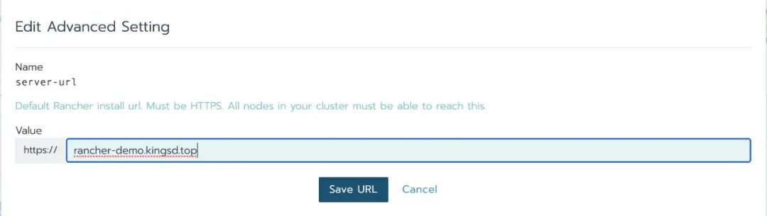 4、进入到Setting-> Advanced Settings页面,修改server-url的地址为你定义的域名,本例为: rancher-demo.kingsd.top