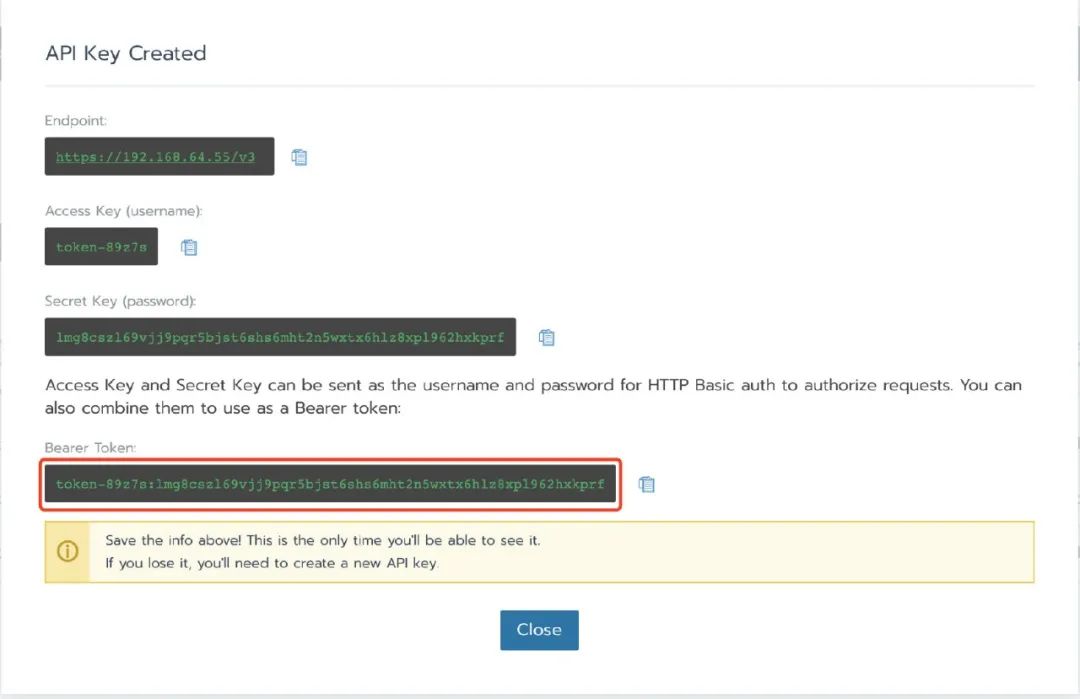 在 Rancher UI 上创建 API token(用户-> API & Keys)并保存Bearer Token