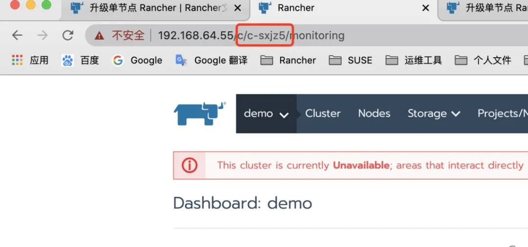 重新登录 Rancher UI,下游集群的状态为Unavailable: