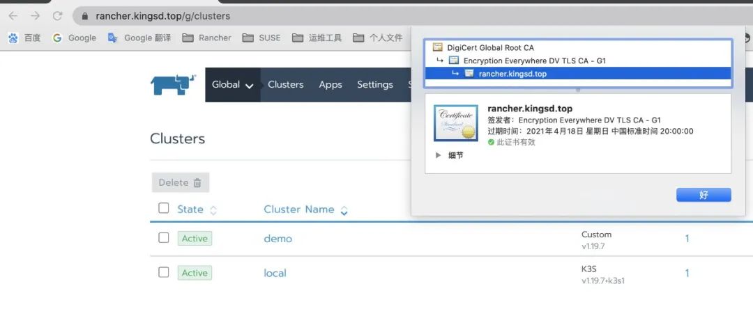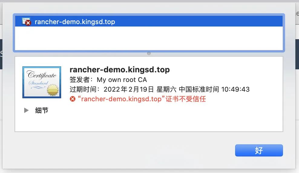 此时,再次查看 Rancher Server 的证书,已经替换为可信证书: