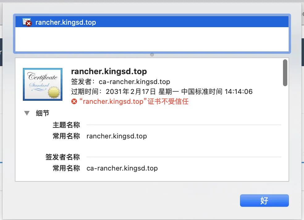 此时,再次查看 Rancher Server 的证书,已经替换为自签名的证书: