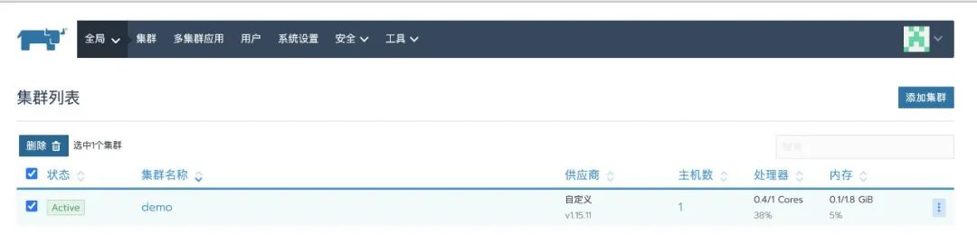 1、启动Rancher v2.3.1,并且添加下游集群,操作步骤可以参考官网: