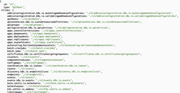 k3s安装过程较为简单直接略过,steve的编译直接参考Makefile/Dockerfile即可。成功编译后,会在本地生成一个steve:latest的镜像,然后使用docker run -itd --net=host -v ${HOME}/.kube:/root/.kube steve:latest启动steve,我们就能够获得一个Kubernetes Native的Rancher API。访问“https://<ip>:9443/v1”可以查看效果: