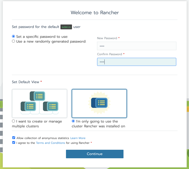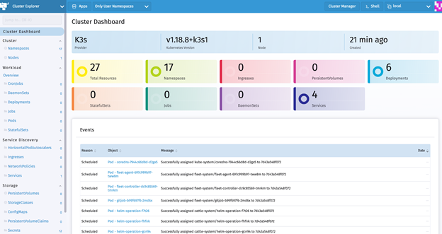 启动完成后,首次进入登录页,除了配置初始化密码外,还要设置默认视图。两个视图分别是:多集群管理和单集群管理,前者沿用Rancher2.4 UI并做增强,后者就是前文介绍的Kubernetes Native Dashboard。对于Native Dashboard,由于启动时增加了privileged提权参数,所以可以在容器中启动一个完整的local集群,原先docker run方式只能启动的是kube-api,并非一个完整集群,现在通过新的Dashboard则可以完整管理它,在local集群上新建workload,当然我们相信你只会在开发测试时如此使用。