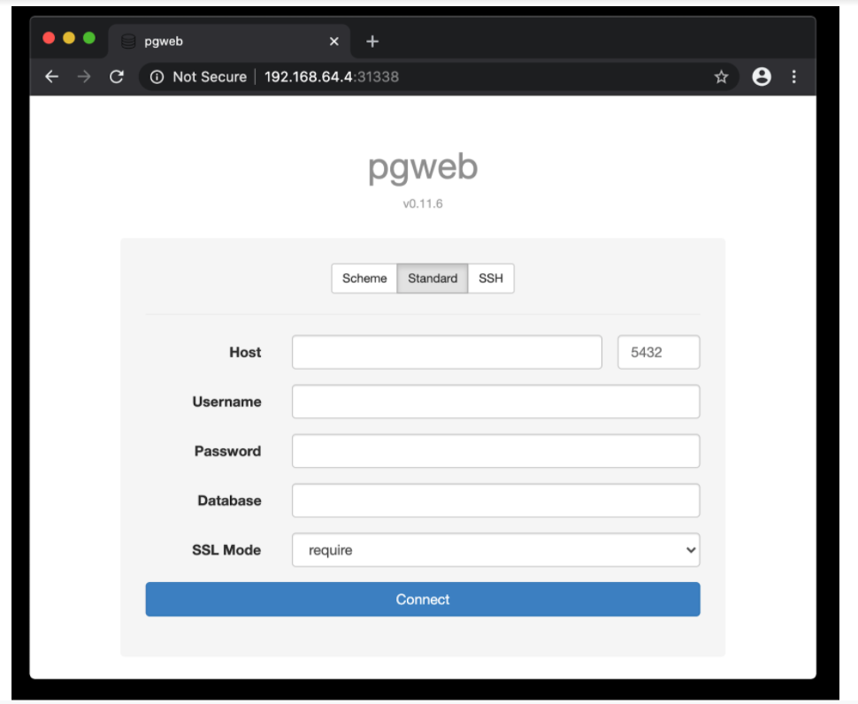 现在回到我们的Pgweb登录页面,用以下信息登录: