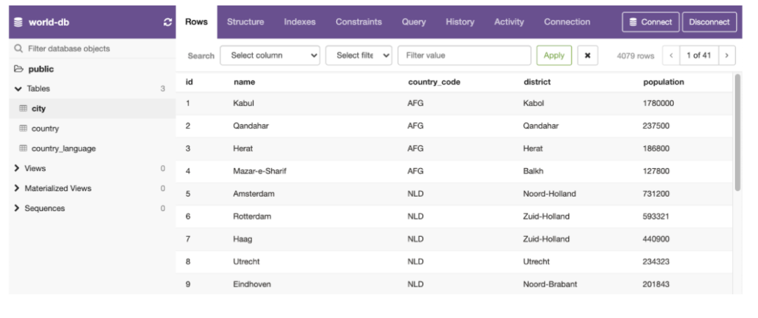 现在你已经连接到数据库,点击左侧表格中的“city”: