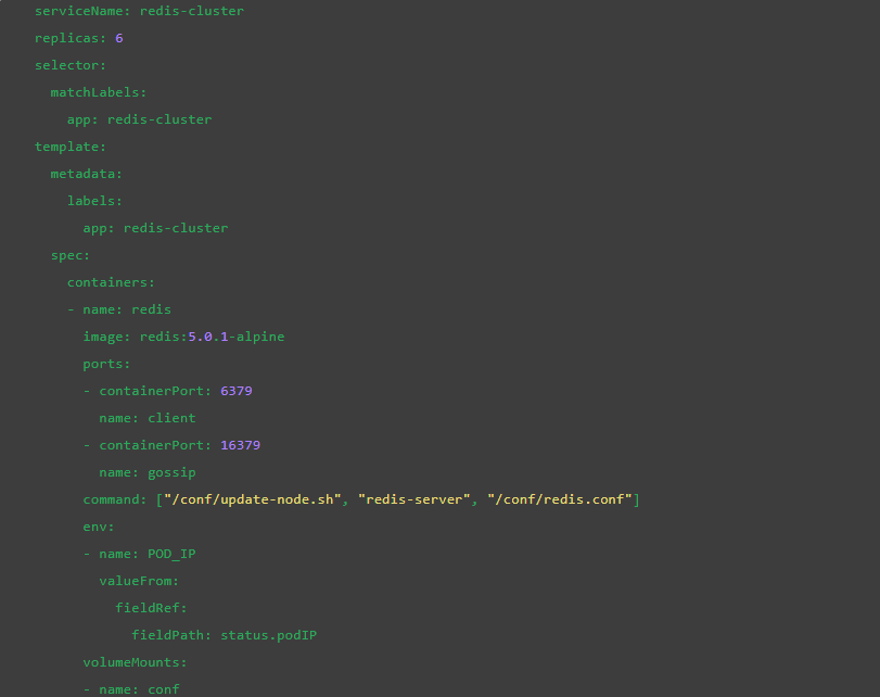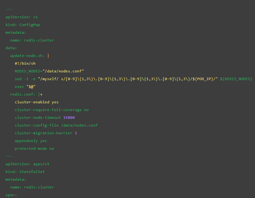 在创建集群时,我们创建了ConfigMap,该ConfigMap又在/conf/update-node.sh处创建了一个脚本,容器在启动时调用该脚本。该脚本使用本地节点的新IP地址更新Redis配置。有了confic中的新IP,集群就可以在新的pod中以不同的IP地址启动并恢复。