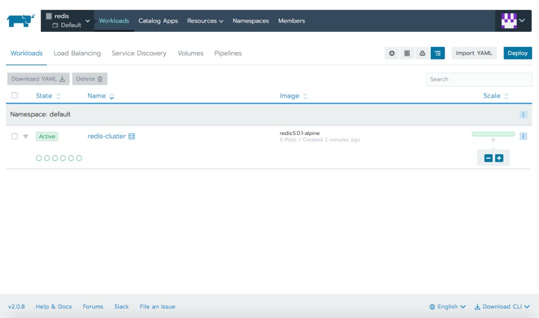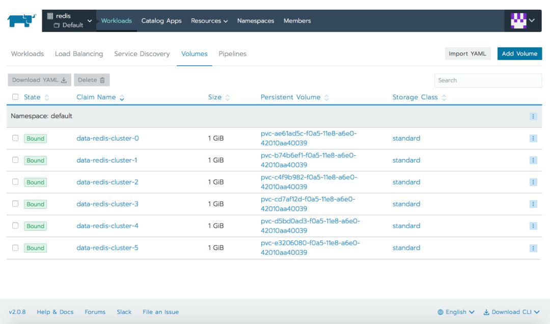 接着部署Redis集群,我们既可以通过kubectl来应用YAML文件,也可以将它们导入到Rancher UI中。下面列出了我们所有需要的YAML文件。