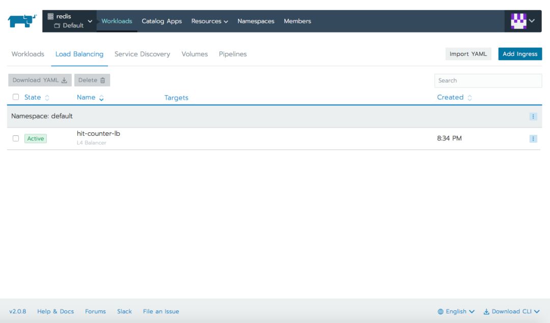 Rancher展示了我们创建的资源:一个包含python应用的pod,以及LoadBalancer类型的服务。该服务的详细信息内,将显示其公共IP地址: