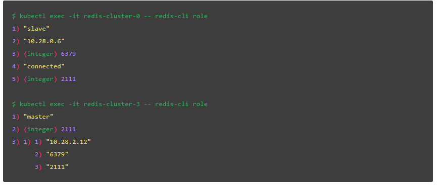 $ kubectl exec -it redis-cluster-0 -- redis-cli --cluster create --cluster-replicas 1 $(kubectl get pods -l app=redis-cluster -o jsonpath='{range.items[*]}{.status.podIP}:6379 ')