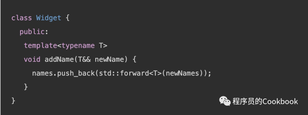 函数的参数传递方式有很多种,可以是值拷贝、传指针、传引用、甚至是移动。下面这个addName函数就是将外部传入的值存放到其内部的一个私有的容器中,为了让传递的过程更加高效,addName同时支持引用传递和移动两种方式。