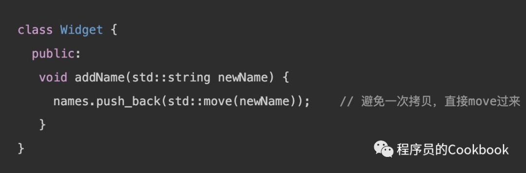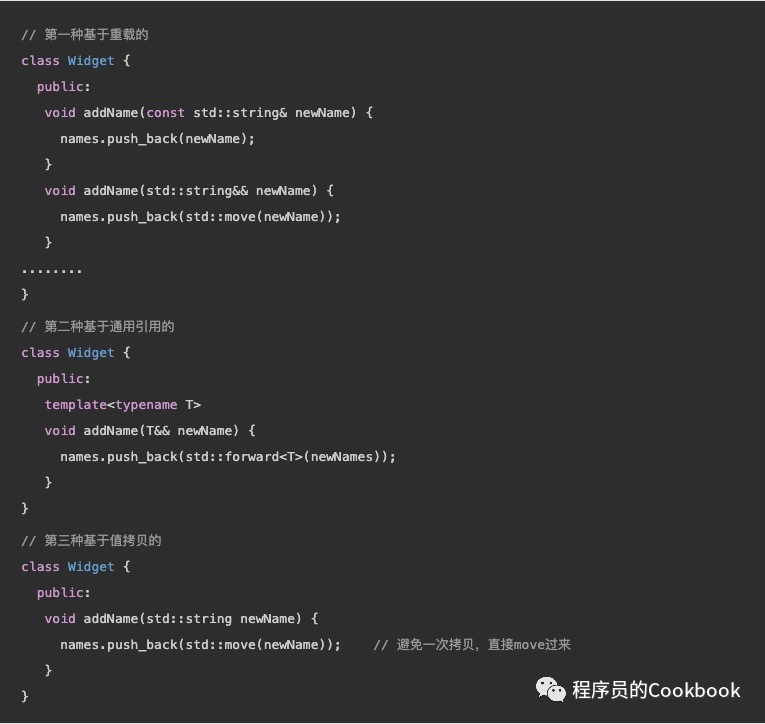 上面的代码中,在内部通过std::move避免了一次拷贝,因为我们知道行参newName其实是一个临时的值,不会被其它代码访问到,这也是最后一次对newName的访问,所以是可以直接移动过来的。这种方法的好处就是避免了将代码写在头文件中,避免了通用引用带来的一些失败的case,避免出现一些莫名奇妙的编译错误。坏处自然就是多了一次字符串的拷贝,性能可能会有损失。在C++98中无论用户传递的是什么,上面的代码都避免不了一次字符串的拷贝过程,但是到了C++11则不然,如果传递的是左值,那么很自然是要进行拷贝的,如果传递的是右值会直接调用移动构造赋值操作符,这样就不会进行拷贝了。