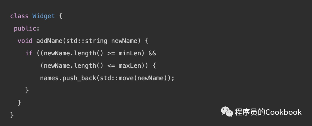4. 只有当参数总是需要拷贝的时候才使用传值的方式,考虑一种情况,假设当我们拷贝一个参数到一个内部的容器时,我们可能会在此之前会对这个参数进行一些合法性检查,只有当满足条件的时候才会考虑添加到容器中,否则不添加,可以使用下面代码表示: