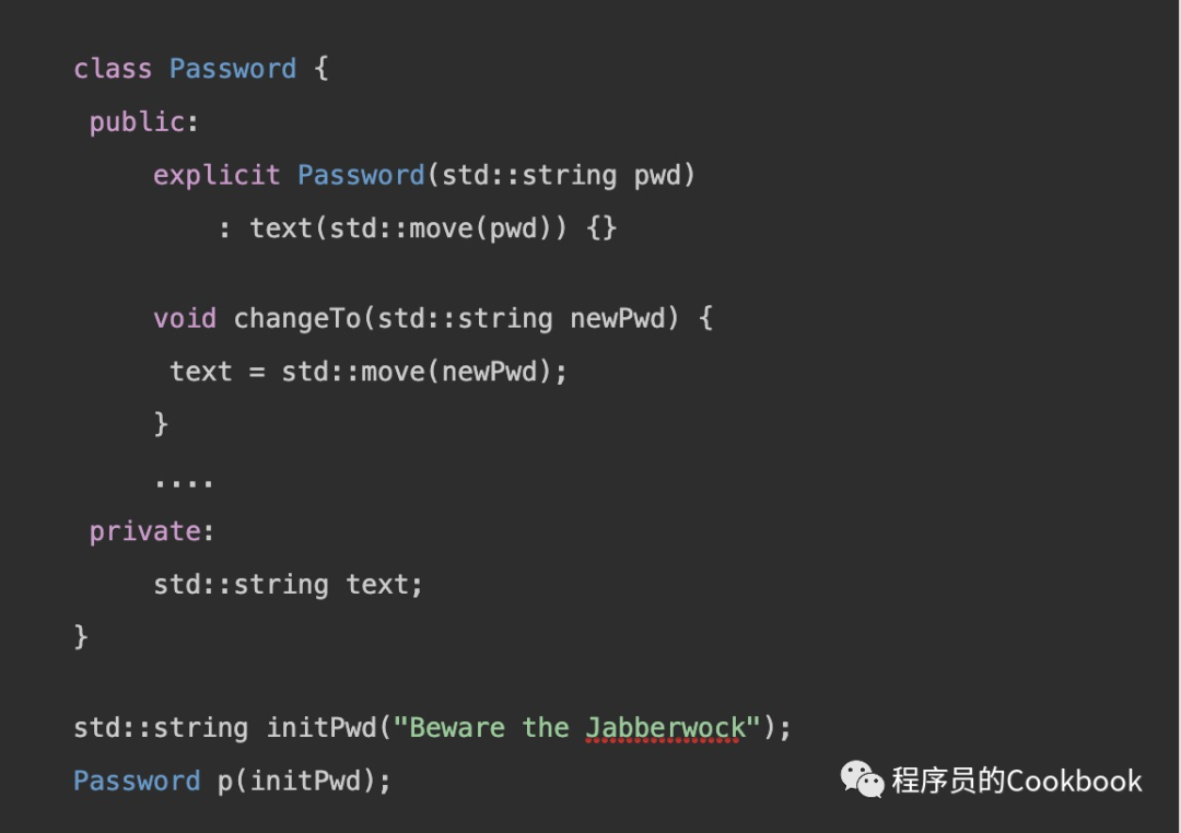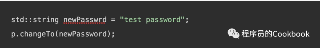 changeTo中使用的是赋值构造,函数的参数使用的是值传递的方式,这种情况导致了程序有比较严重的性能问题。传递进来的参数newPwd是一个左值,因此当newPwd被构造的时候,std::string的拷贝构造函数会被调用,在这个构造函数中会进行内存的分配,等构造完成后内部会使用std::move进行移动赋值构造,这会导致p.text原来指向的内存被释放。整个更改密码的过程中涉及了两次内存的分配或释放。但是如果使用下面这段代码将有可能避免一次内存的分配或释放。