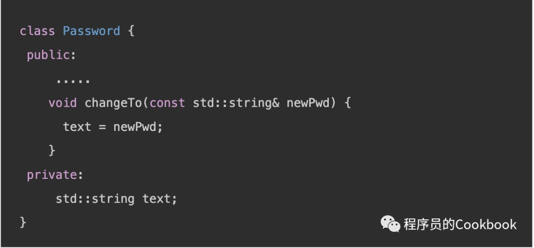 当参数传递使用赋值的方式,这种情况相比前者要复杂的多,例如有一个表示密码的类,因为密码可能会被改变,所以这个类提供了一个setter函数changeto,这个函数通过值传递的策略,下面是这个类的实现。