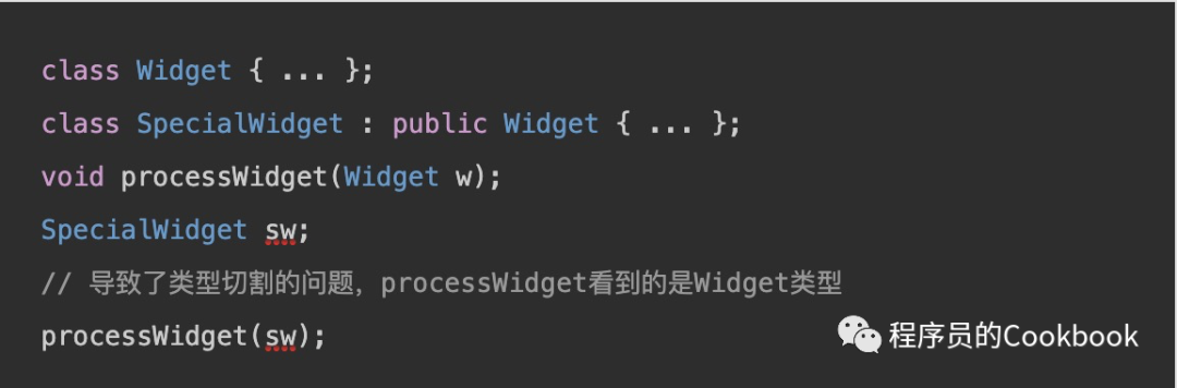 在本文的最后我们来讨论一个与性能无关的话题,但是这个话题仍然值得我们记住。值传递不像引用传递,它容易受到切割问题的影响。如果你有一个函数被设计成接收一个基类或是任何一个派生类,你不应该将其声明为值传递的方式,因为这会造成类型切割的问题。例如下面这个例子: