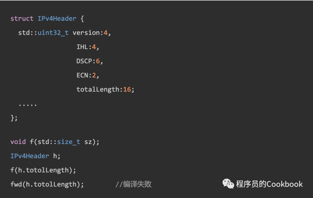 被传递给f的时候可以正常工作,当传递给fwd完美转发的时候编译失败,因为fwd是一个模版,模版的参数是通用引用,本质上是一个引用,C++标准规定一个非const的引用无法引用一个位域字段。这个规定也是有原因的,因为位域可能只是一个int的部分字节,没有一个确定的地址,没办法通过指针指向位域,引用本质上就是指针,自然没办法引用位域了。既然没办法对一个位域进行引用那么可以通过拷贝位域的值后然后再进行完美转发,代码如下: