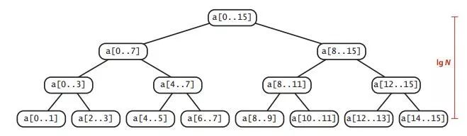 下面的树状图直观地表示了归并排序的执行过程,每个结点都表示一个sort()方法通过merge()方法归并而成的子数组。对于长度为N的数组,这颗二叉树的高度为lgN,在经过层层归并的过程中,每一层都最多需要N次比较,比如将a[0..7]和a[8..15]归并为a[0..15]时,16个元素都会经过一次比较被放回原数组,然后再往下层走,不管需要几次归并,处理的元素都是16个,既16次比较。每层N次比较,则一共NlgN次比较。