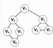 对于上图的结构,若采用深度优先的方式遍历,则首先访问出发顶点V,然后依次从V出发搜索V的任意一个邻接点W,如果W没有访问过,则从该点出发继续深度优先遍历。遍历结果可以为:V1, V2, V4, V8, V5, V3, V6, V7。