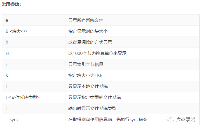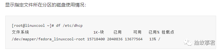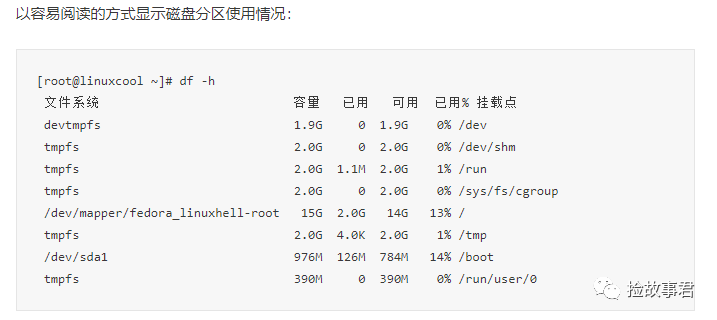df命令的英文全称即“Disk Free”,顾名思义功能是用于显示系统上可使用的磁盘空间。默认显示单位为KB,建议使用“df -h”的参数组合,根据磁盘容量自动变换合适的单位,更利于阅读。