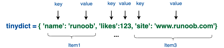 dict = {'name': 'runoob', 'likes': 123, 'url': 'www.runoob.com'}