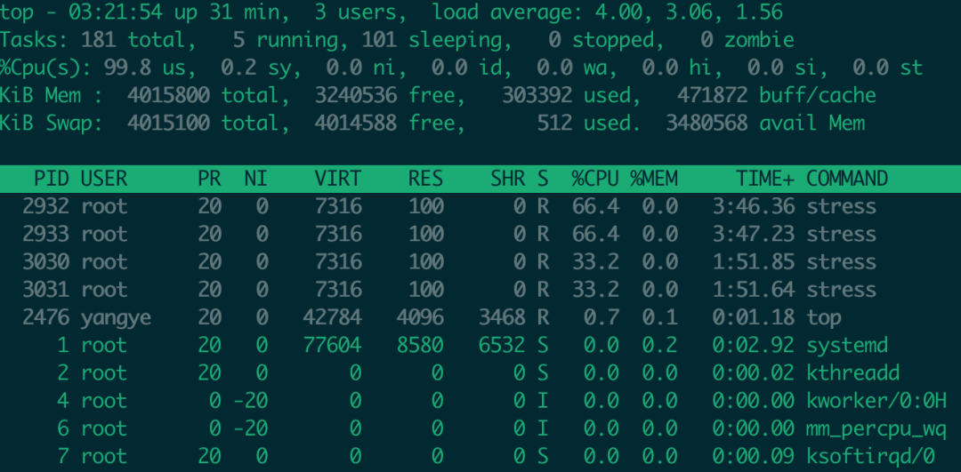 我们在宿主机上通过top命令能够明显看出效果:containerA消耗的CPU是containerB的两倍:
