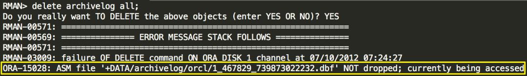 ORA-15028: ASM file '+TEST/mydb/archivelog/...' not dropped; currently being accessed