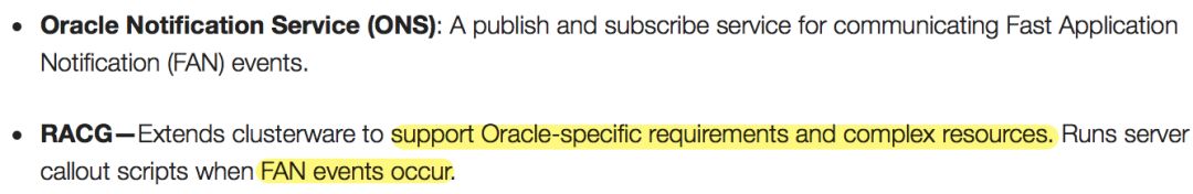 ORACLE对于racg有如下描述,racg是集群件的扩展,能够满足ORACLE特定的需求和复杂的资源,当有FAN事件发生时,racg运行服务标注脚本。