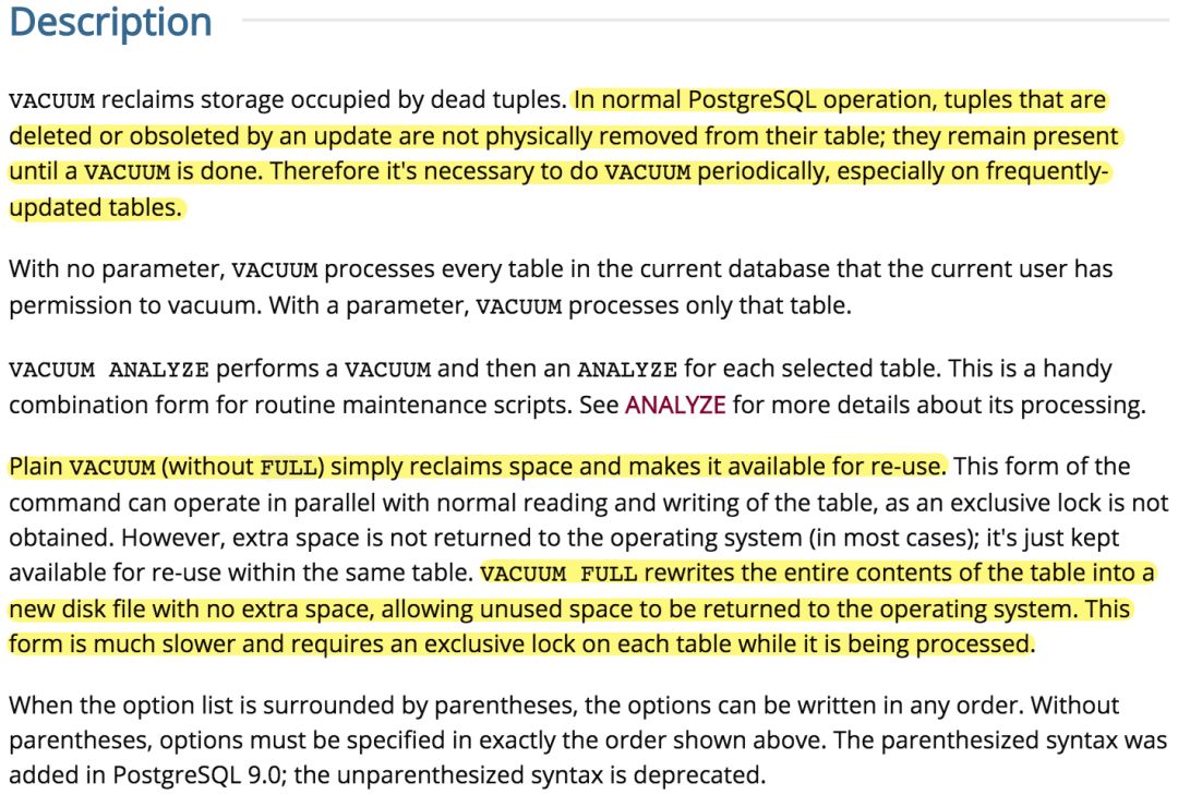 通常在对postgres数据库的表做变更后,需要做vacuum,postgres文档描述如下