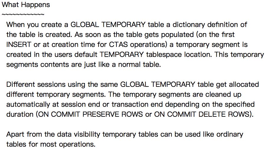 全局临时表在ORACLE 8i中被引进,当创建一张全局临时表,该表的字典定义即被创建,但是只有在第一次往表中填充数据时,临时段才会被分配,就是说只有用户对全局临时表做第一次插入操作或者CTAS操作时,才会为全局临时表分配存储空间。