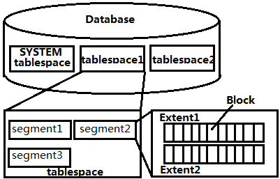 ORACLE的逻辑存储结构如下图所示,表空间--->段--->区--->块