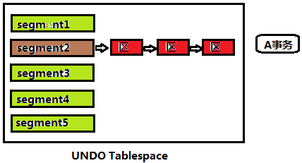 如上图所示, UNDO表空间内分配了5个UNDO回滚段,绿色的段1,3,4,5表示没有被分配,它们的状态是Free;
