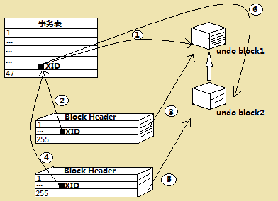就是说事务表在UNDO段头块里,事务槽在被修改的数据块里,事务ID用来标识每一个不同的事务。